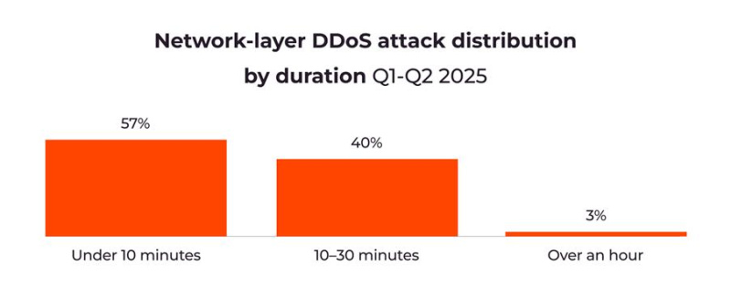 Attacks shorter than 10 minutes have decreased by about 33%, while those lasting between 10 and 30 minutes have nearly quadrupled. While previous reports highlighted the dominance of very short, intense DDoS attacks, this change indicates that attackers are adapting to the improved automatic detection and mitigation systems employed by companies to handle brief attacks. By extending attack durations, threat actors can circumvent these temporary defense thresholds, cause more extensive damage, and test infrastructure resilience over time.