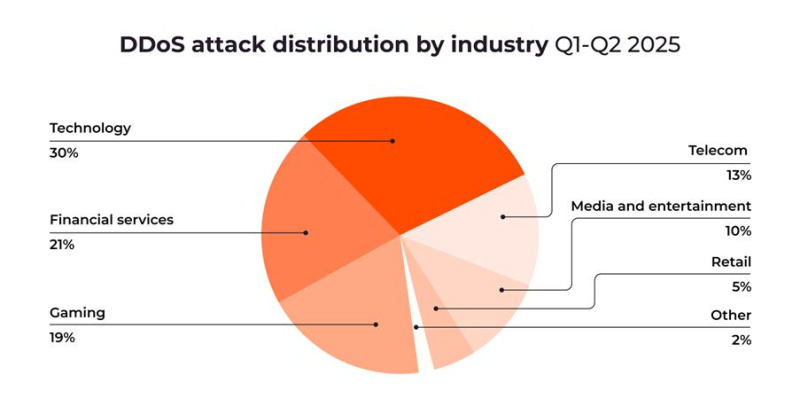 Gaming is no longer the dominant target it once was. Its share of total DDoS attacks has dropped significantly (30% in the last year). This notable decline suggests attackers are shifting focus to other sectors such as tech (attacks increased by 15%) and financial services (attacks increased by 15%). These sectors are favored targets because they may be less protected against threat actors and have higher disruption potential.